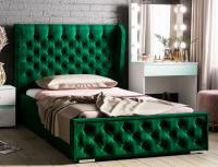 высокое мягкое изголовье имеет декоративную стяжку с пуговицами, такой прием придает кровати элегантности.