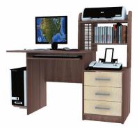 В правой части стола находится надстройка с открытыми полками и вертикальной нишей с решетками для CD-дисков, под которой гармонично расположилась тумба с тремя вместительными выдвижными ящиками. Слева – открытая ниша под системный блок, здесь же могут быть сумка для ноутбука или портфель. Также стол имеет выдвижную полку для клавиатуры.